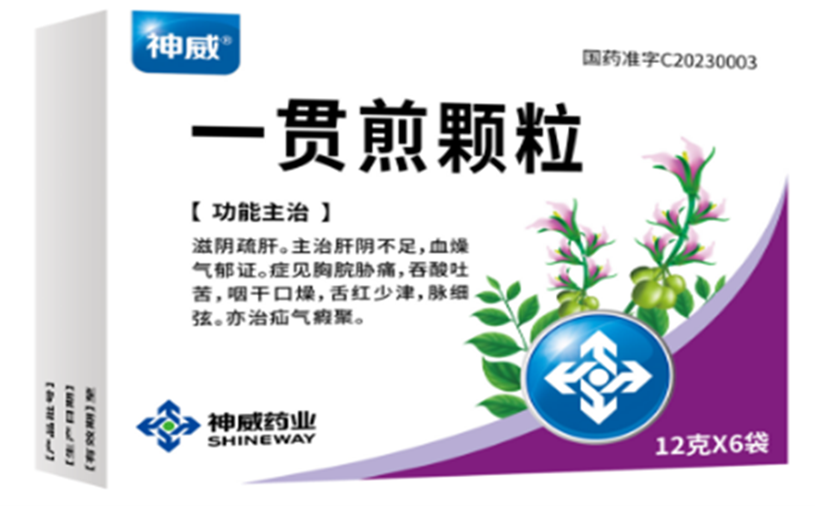 一贯煎颗粒主治肝阴不足,血燥气郁证。症见:胸脘胁痛,吞酸吐苦,咽干口燥,舌红少津,脉细弦。亦治疝气瘕聚。先后被纳入《一贯煎颗粒临床应用专家共识(2024)》《慢性乙型肝炎中西医结合诊疗专家共识(2024)》《干燥综合征病证结合诊疗指南》等指南与共识。现代药理研究证明,一贯煎颗粒具有保肝、抗肿瘤、护胃作用和滋阴疏肝的功效,在临床上应用广泛,填补了慢性胃炎、慢性乙型肝炎、肝纤维化、肝硬化、原发性肝癌、干燥综合征、更年期综合征等疾病证属肝阴不足,血燥气郁的临床用药空白,是临床上滋阴疏肝的首选方剂。